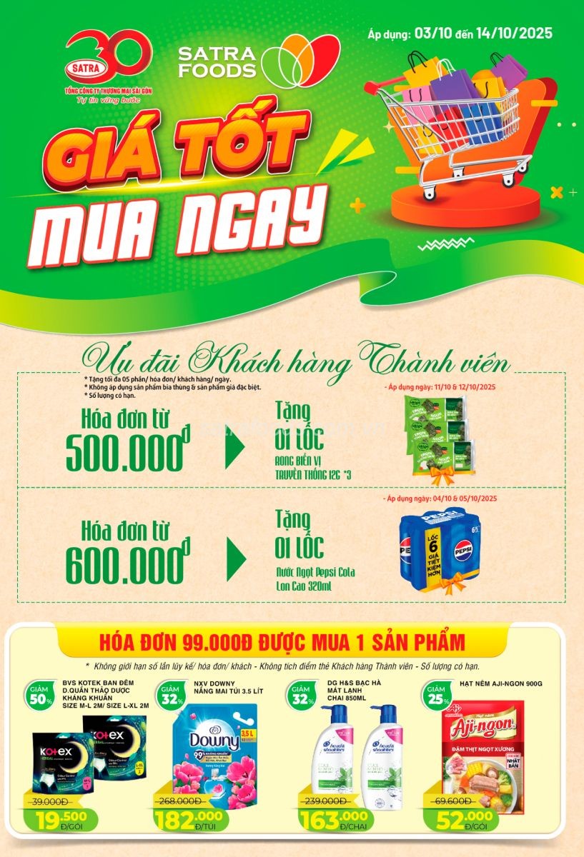 Từ ngày 03/10 đến ngày 14/10/2025, Satrafoods thực hiện chương trình giảm giá siêu tốt cùng ưu đãi hấp dẫn sau: (*)