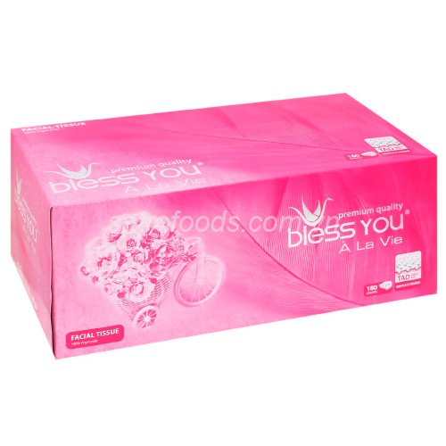 Khăn giấy thương hiệu khăn giấy Bless You - sản xuất tại Việt Nam. Không mùi, thành phần 100% bột giấy nguyên thủy an toàn cho da khi sử dụng. Khăn giấy lụa Bless You À La Vie 2 lớp hộp 180 tờ thấm hút tốt, mềm và siêu mịn dùng vệ sinh cá nhân.