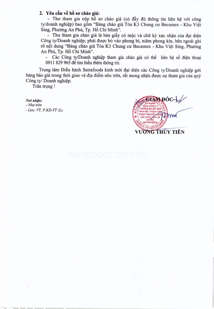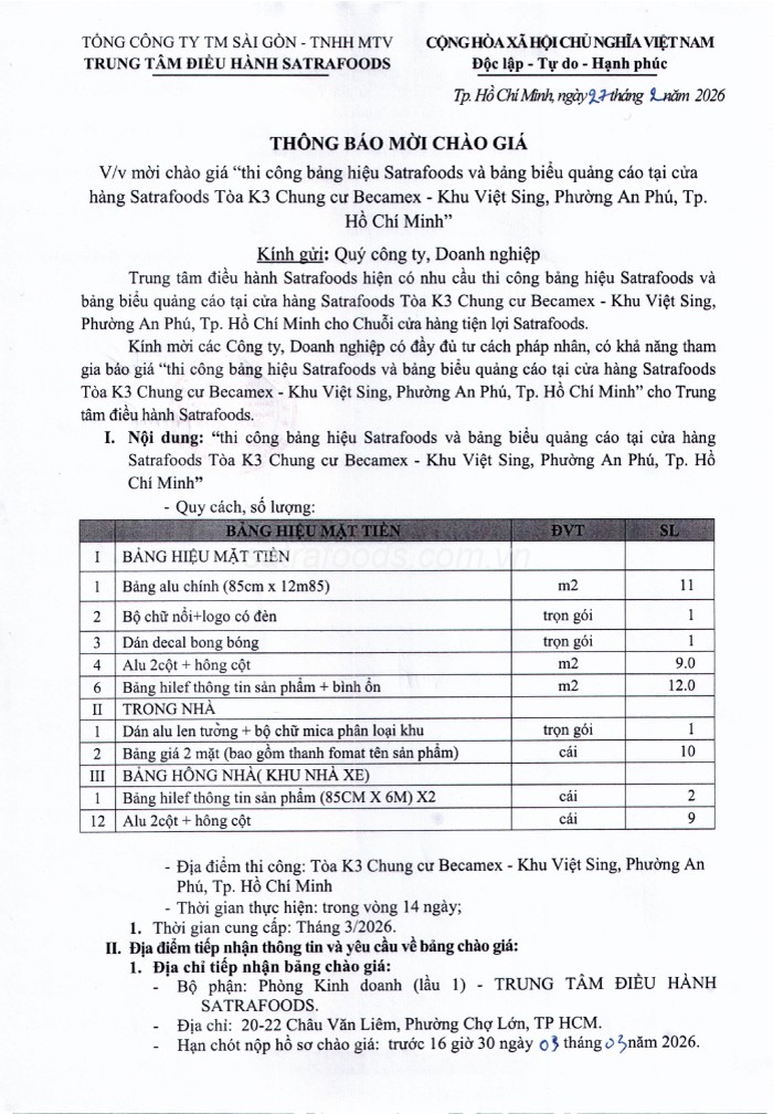 Thư tham gia chào giá các gói thầu trên phải được bỏ vào phong bì, niêm phong kín, bên ngoài ghi rõ nội dung “Thi công bảng hiệu Satrafoods và bảng biểu quảng cáo tại cửa hàng Satrafoods Tòa K3 Chung cư Becamex - Khu Việt Sing, Phường An Phú, TP.HCM” gửi đến văn phòng Trung tâm Điều hành Satrafoods: