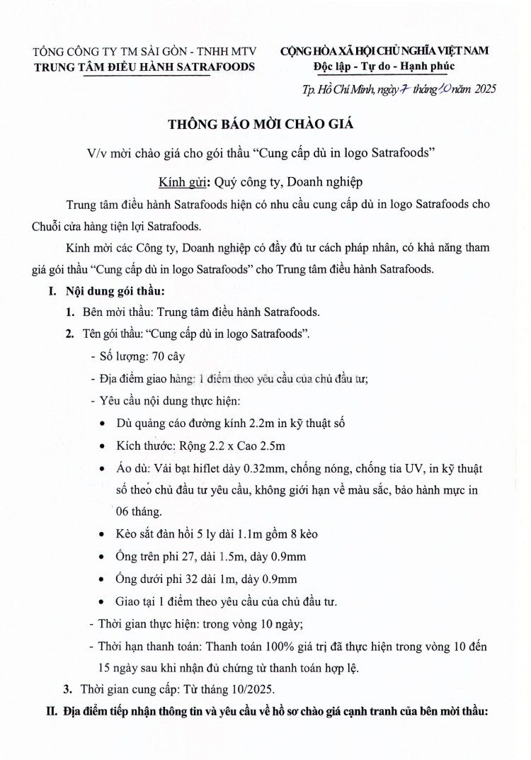 Satrafoods kính mời các đơn vị tham gia gói thầu "Cung cấp dù in logo Satrafoods"