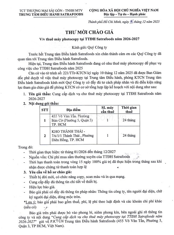 Satrafoods kính mời các đơn vị tham gia gói thầu cho thuê máy photocopy tại Trung Tâm Điều Hành Satrafoods năm 2026-2027
