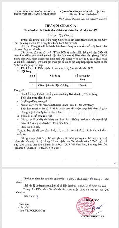 Thư tham gia chào giá các gói thầu trên phải được bỏ vào phong bì, niêm phong kín, bên ngoài ghi rõ nội dung “Cung cấp kiểm định cân điện tử cho hệ thống cửa hàng Satrafoods năm 2026” gửi đến văn phòng Trung tâm Điều hành Satrafoods: